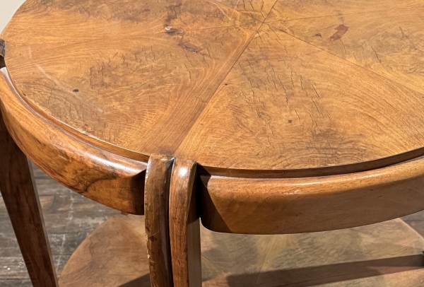 Two-tier table in oak with walnut veneer , supported by six carved and tapered legs, ending in scrolled feet. Antique condition.