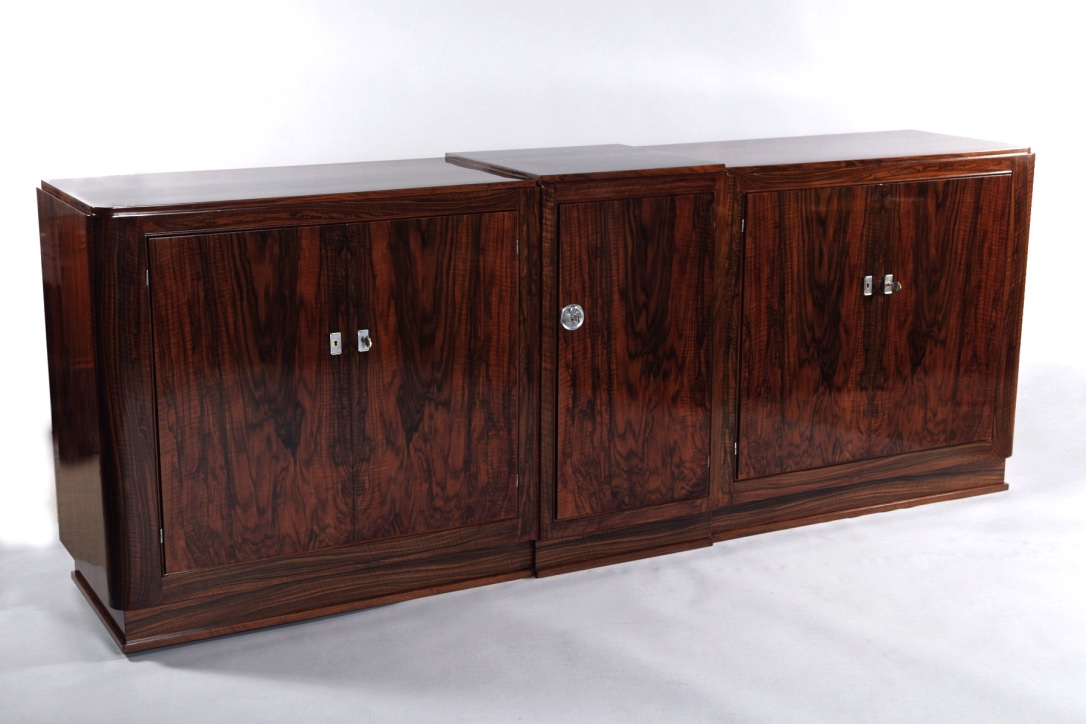 American Walnut. Five-door sideboard raised on a stepped plinth. Very fine bookmatch veneer on all sides. The doors are fitted with nickel-plated hardware and exquisite keys. The interior is fitted with shelves and drawers in solid oak.