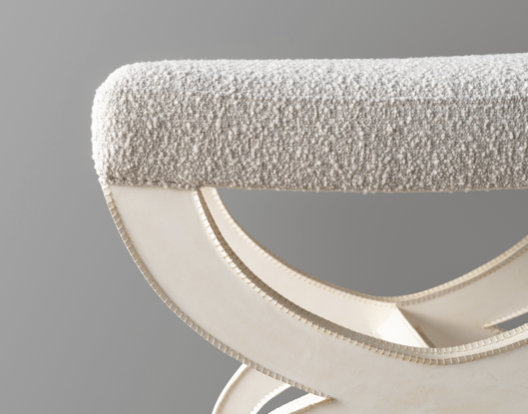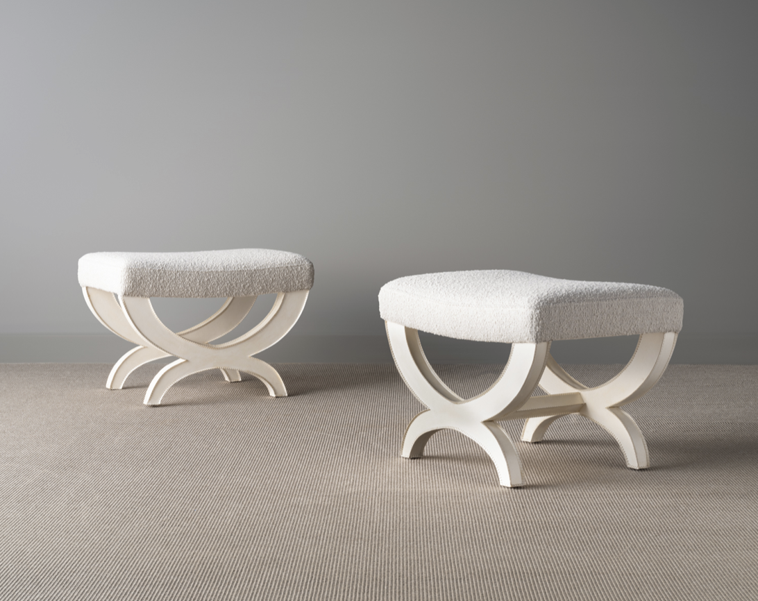 Parchment covered x-stools, the edges of the parchment featuring overstitch technique.